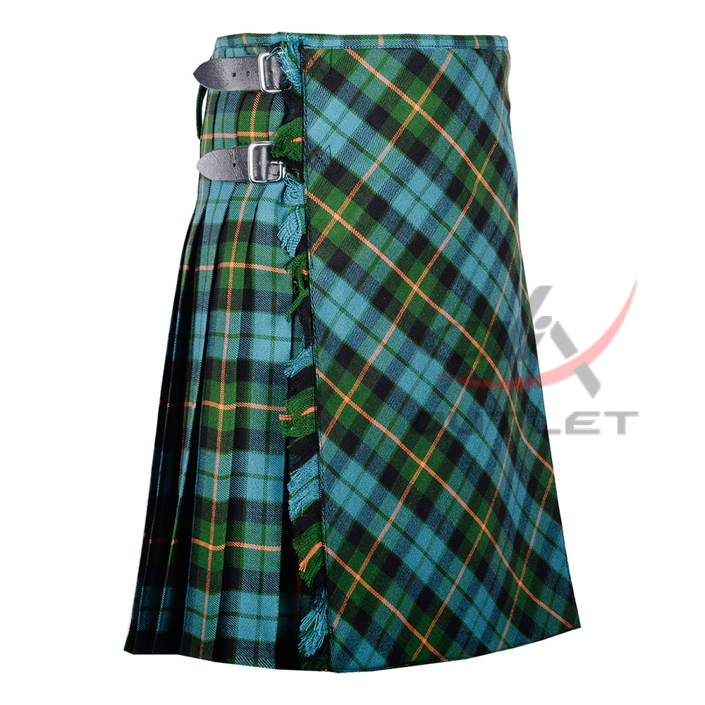 Bias Cut Gunn Ancient Tartan 8Yard Kilt with Apron is a classic 8-yard Scottish highlander kilt featuring a bias-cut apron for a stylish drape. Made from a durable 16 oz. acrylic wool and cotton blend, it offers both tradition and comfort.