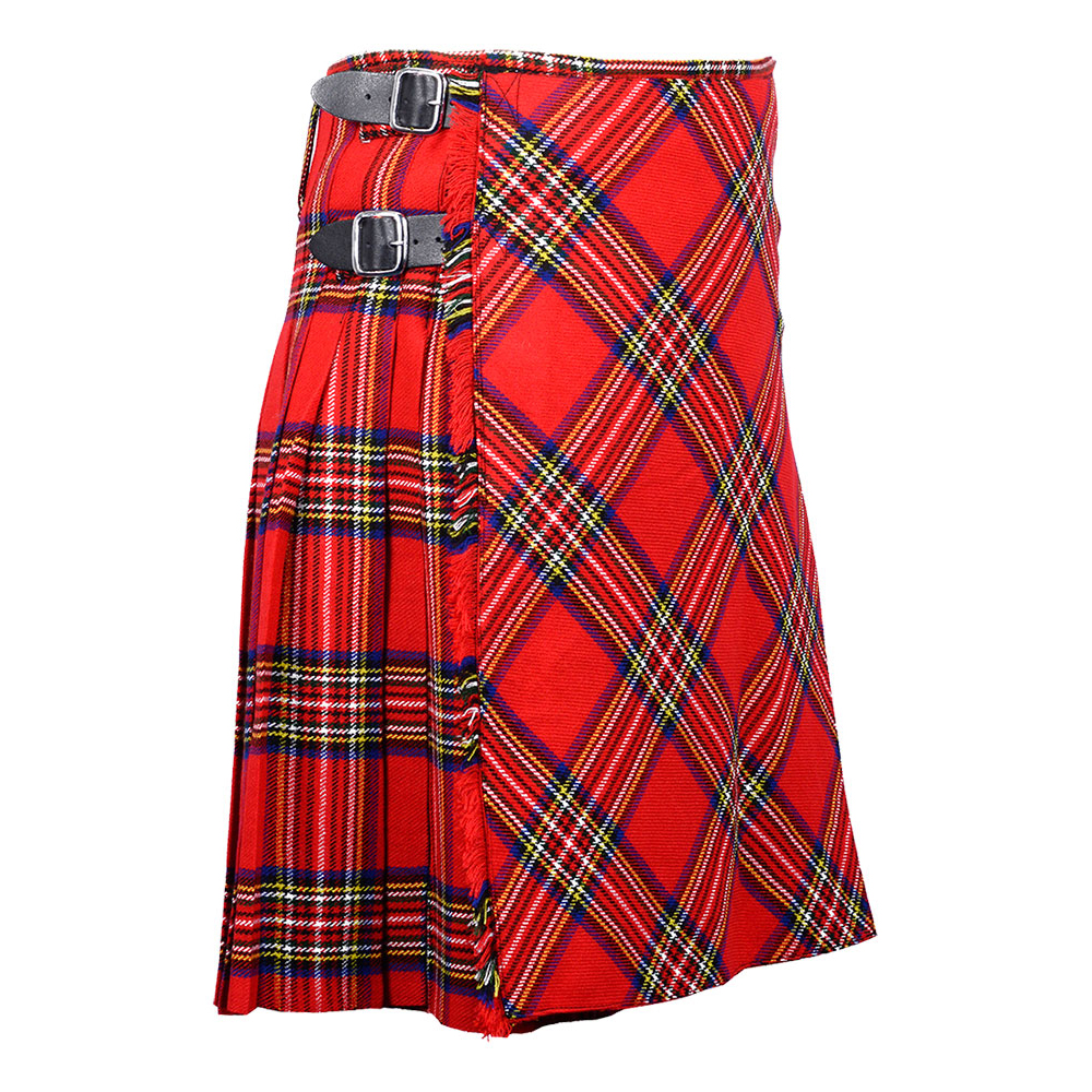 Bias Cut Royal Stewart Tartan 8Yard Kilt with Apron The Royal Stewart Tartan Kilt is a classic 8-yard Scottish highlander kilt featuring a bias-cut apron for a stylish drape. Made from a durable 16 oz. acrylic wool and cotton blend, it offers both tradition and comfort.
