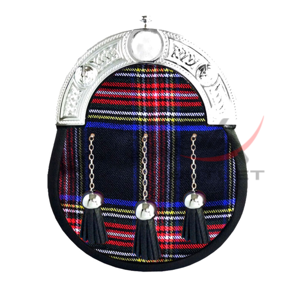 Black Stewart Tartan Full Dress Leather Sporrans Introducing the Scottish Kilts Outfit Sporran, crafted from 100% genuine leather with a Celtic silver cantle and chain strap. This traditional Wallace Tartan kilt sporran bag embodies Scottish heritage and clan pride. The Black Watch Tartan Sporran is available in full-dress leather, featuring a customizable clan tartan on the front with three matching leather tassels. Made to order, this sporran combines premium-grade leather with a classic Scottish design, offering both value and durability. It’s an ideal accessory for both formal and informal events, perfect for those seeking quality and affordability.