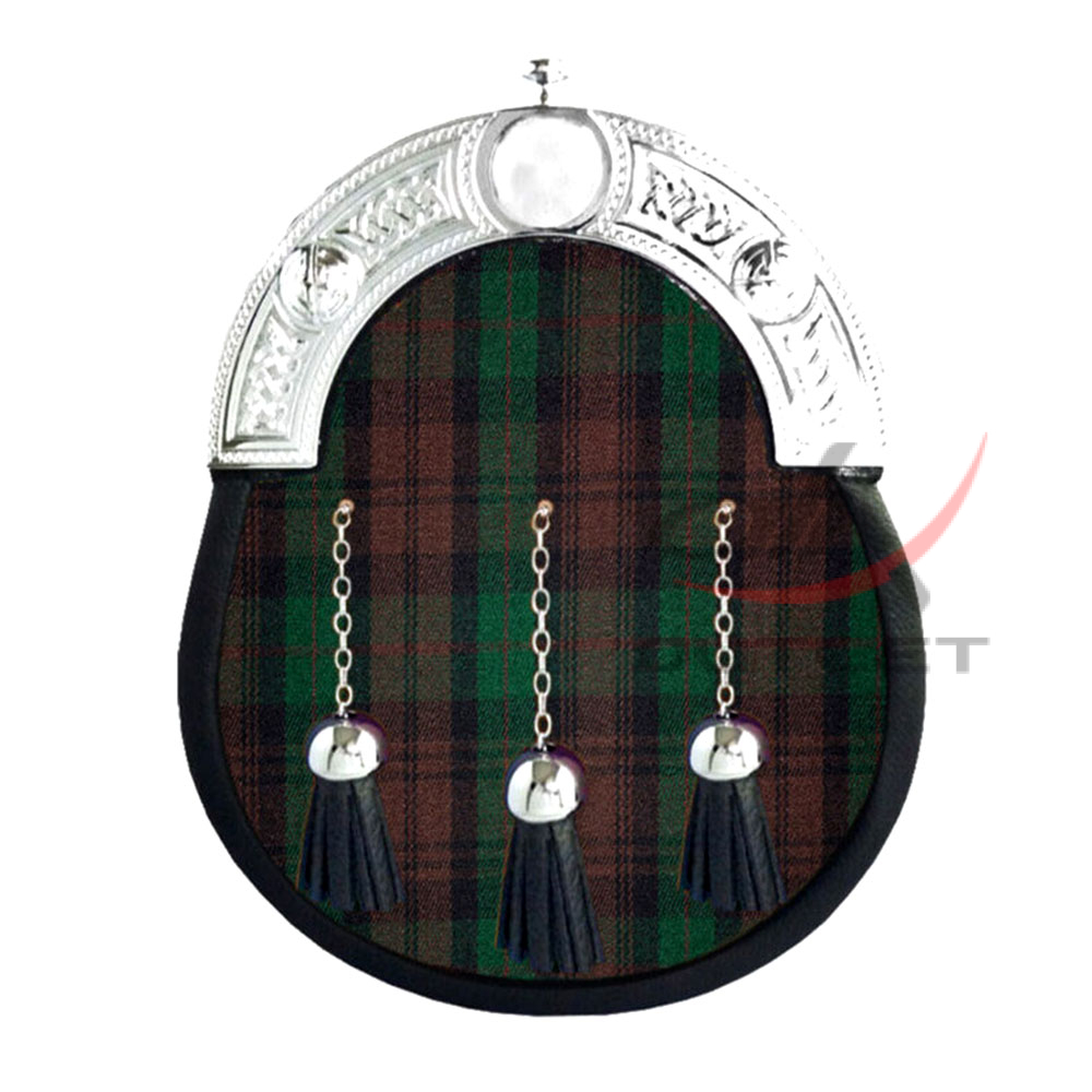 Brown Watch Tartan Full Dress Leather Sporran Introducing the Scottish Kilts Outfit Sporran, crafted from 100% genuine leather with a Celtic silver cantle and chain strap. This traditional Wallace Tartan kilt sporran bag embodies Scottish heritage and clan pride. The Black Watch Tartan Sporran is available in full-dress leather, featuring a customizable clan tartan on the front with three matching leather tassels. Made to order, this sporran combines premium-grade leather with a classic Scottish design, offering both value and durability. It’s an ideal accessory for both formal and informal events, perfect for those seeking quality and affordability.