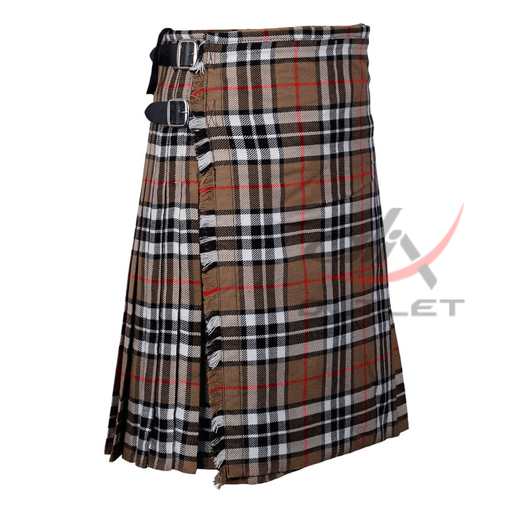 Camel Thomson 8 Yard Kilt for Men Traditional Scottish Kilt. Traditional 8-yard tartan highlander kilt is a knee-length garment made of wool tartan. It is typically made with 8 yards of fabric, which is pleated and folded to create its distinctive shape.
