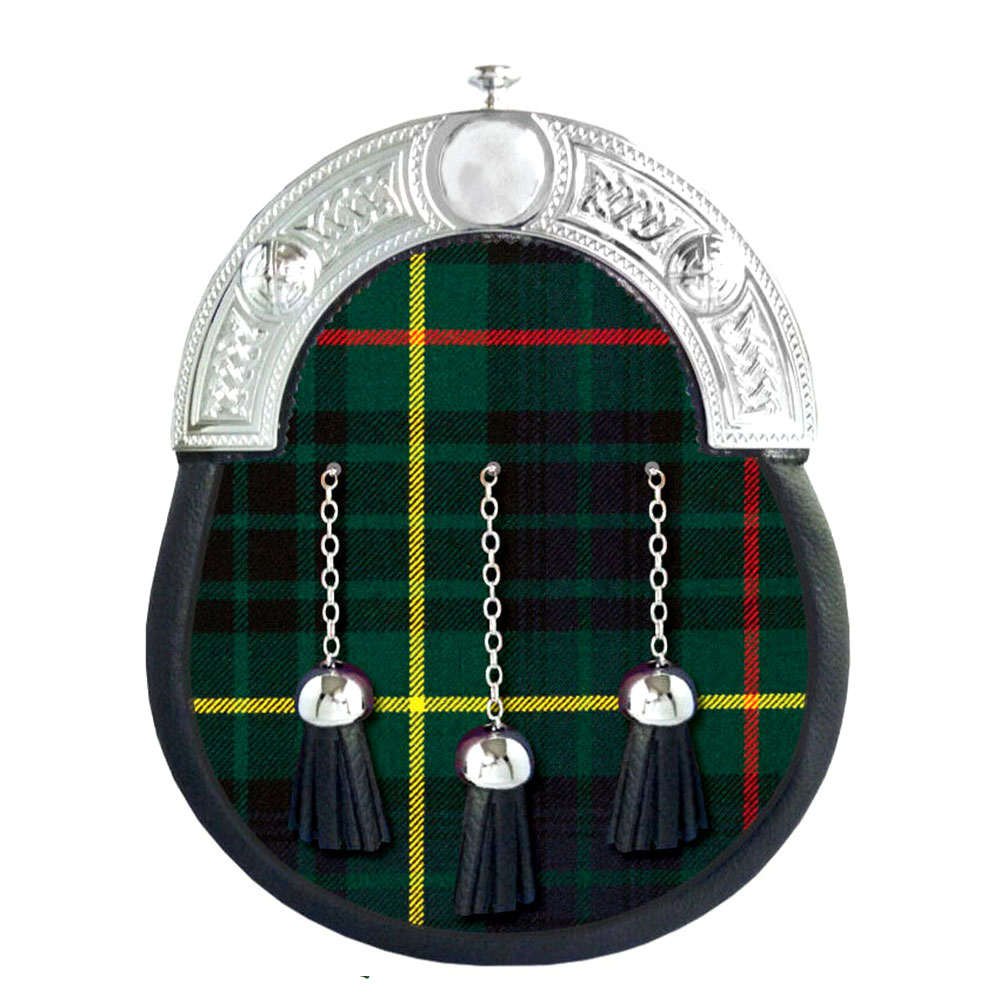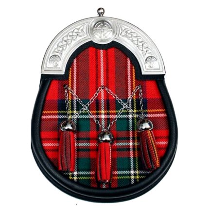 Hunting Stewart Tartan Full Dress Leather Sporrans Introducing the Scottish Kilts Outfit Sporran, crafted from 100% genuine leather with a Celtic silver cantle and chain strap. This traditional Wallace Tartan kilt sporran bag embodies Scottish heritage and clan pride. The Black Watch Tartan Sporran is available in full-dress leather, featuring a customizable clan tartan on the front with three matching leather tassels. Made to order, this sporran combines premium-grade leather with a classic Scottish design, offering both value and durability. It’s an ideal accessory for both formal and informal events, perfect for those seeking quality and affordability.
