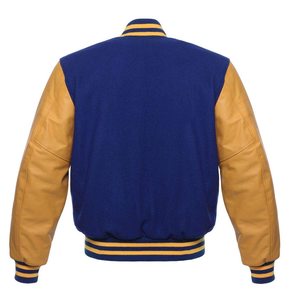 Letterman Jacket Royal Blue Wool & Leather Sleeves features a wool body and Genuine Cow Leather sleeves, Sleeves are available in wool, vinyl or leather. The Varsity Jacket has a stand-up knit trim collar, cuffs and waist and a traditional snap front closure. As with all of our varsity jackets, the Cambridge can be customized with your choice of inner lining, pocket trim and sleeve materials.