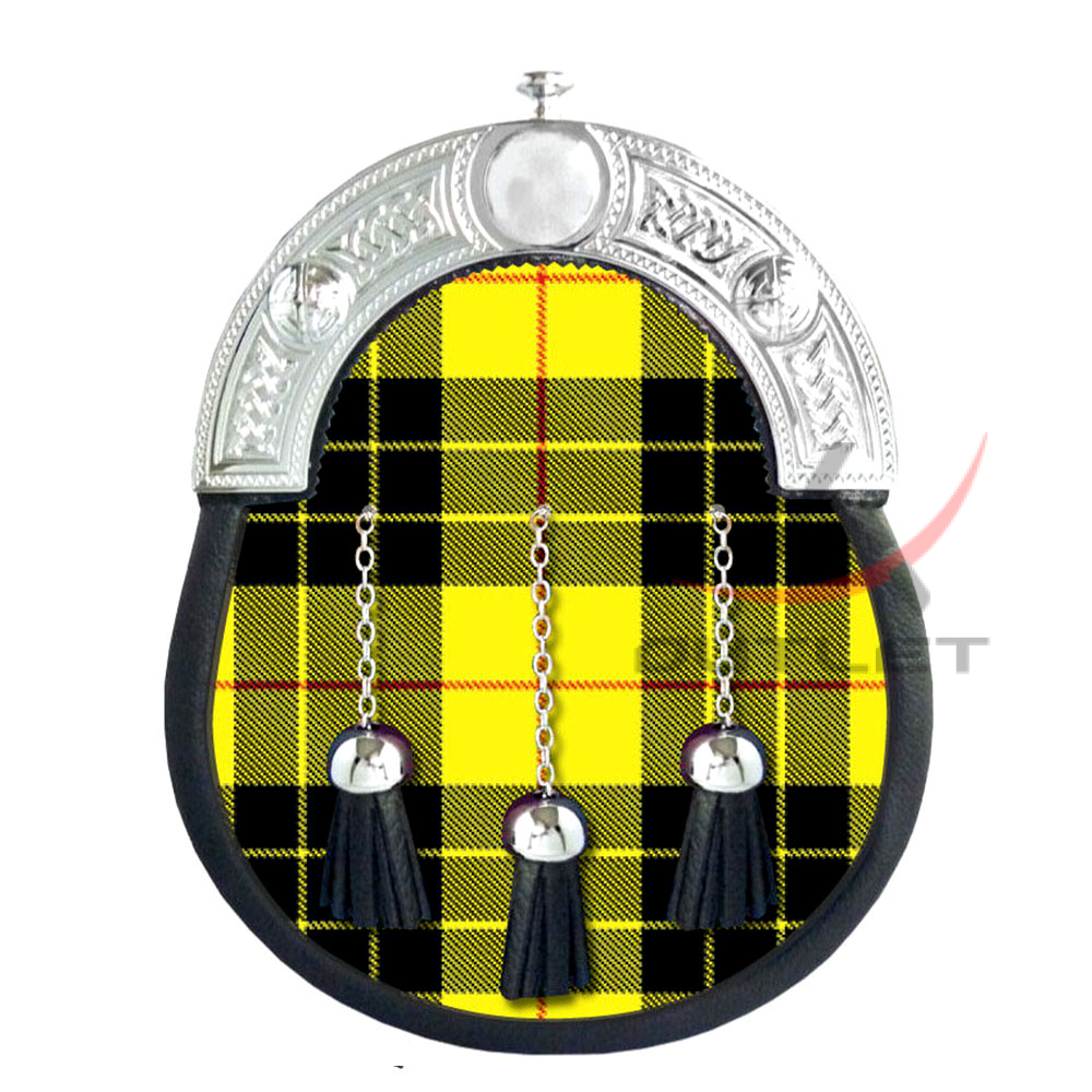 Macleod of Lewis Tartan Full Dress Leather Sporrans Introducing the Scottish Kilts Outfit Sporran, crafted from 100% genuine leather with a Celtic silver cantle and chain strap. This traditional Wallace Tartan kilt sporran bag embodies Scottish heritage and clan pride. The Black Watch Tartan Sporran is available in full-dress leather, featuring a customizable clan tartan on the front with three matching leather tassels. Made to order, this sporran combines premium-grade leather with a classic Scottish design, offering both value and durability. It’s an ideal accessory for both formal and informal events, perfect for those seeking quality and affordability.