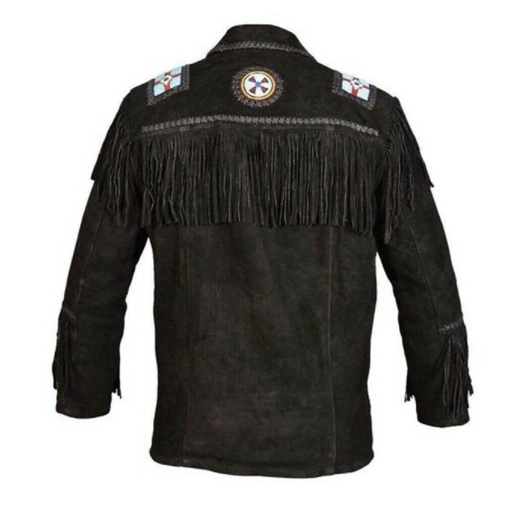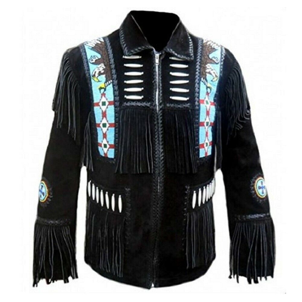 Men’s Cowboy Jacket Fringed Bone & Bead Work is hand-crafted to the highest standards from the finest leather suede, with close attention to detail. This suede fringe jacket made of 100% leather features notched lapels with a button front closure and two front side entry pockets. It has fringe and is fully lined. That is a great and perfect addition to your outerwear collection.