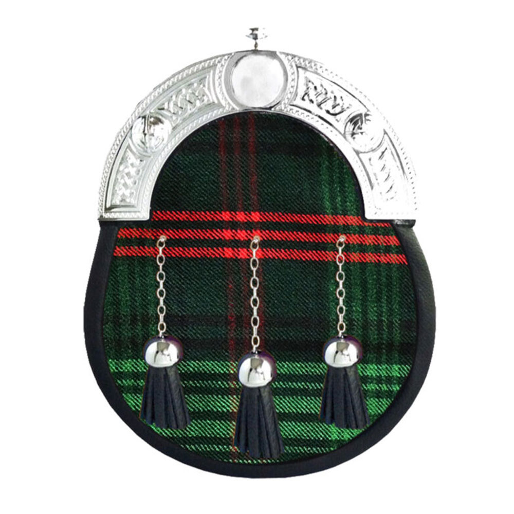 Ross Hunting Tartan Full Dress Leather Sporrans Introducing the Scottish Kilts Outfit Sporran, crafted from 100% genuine leather with a Celtic silver cantle and chain strap. This traditional Wallace Tartan kilt sporran bag embodies Scottish heritage and clan pride. The Black Watch Tartan Sporran is available in full-dress leather, featuring a customizable clan tartan on the front with three matching leather tassels. Made to order, this sporran combines premium-grade leather with a classic Scottish design, offering both value and durability. It’s an ideal accessory for both formal and informal events, perfect for those seeking quality and affordability.