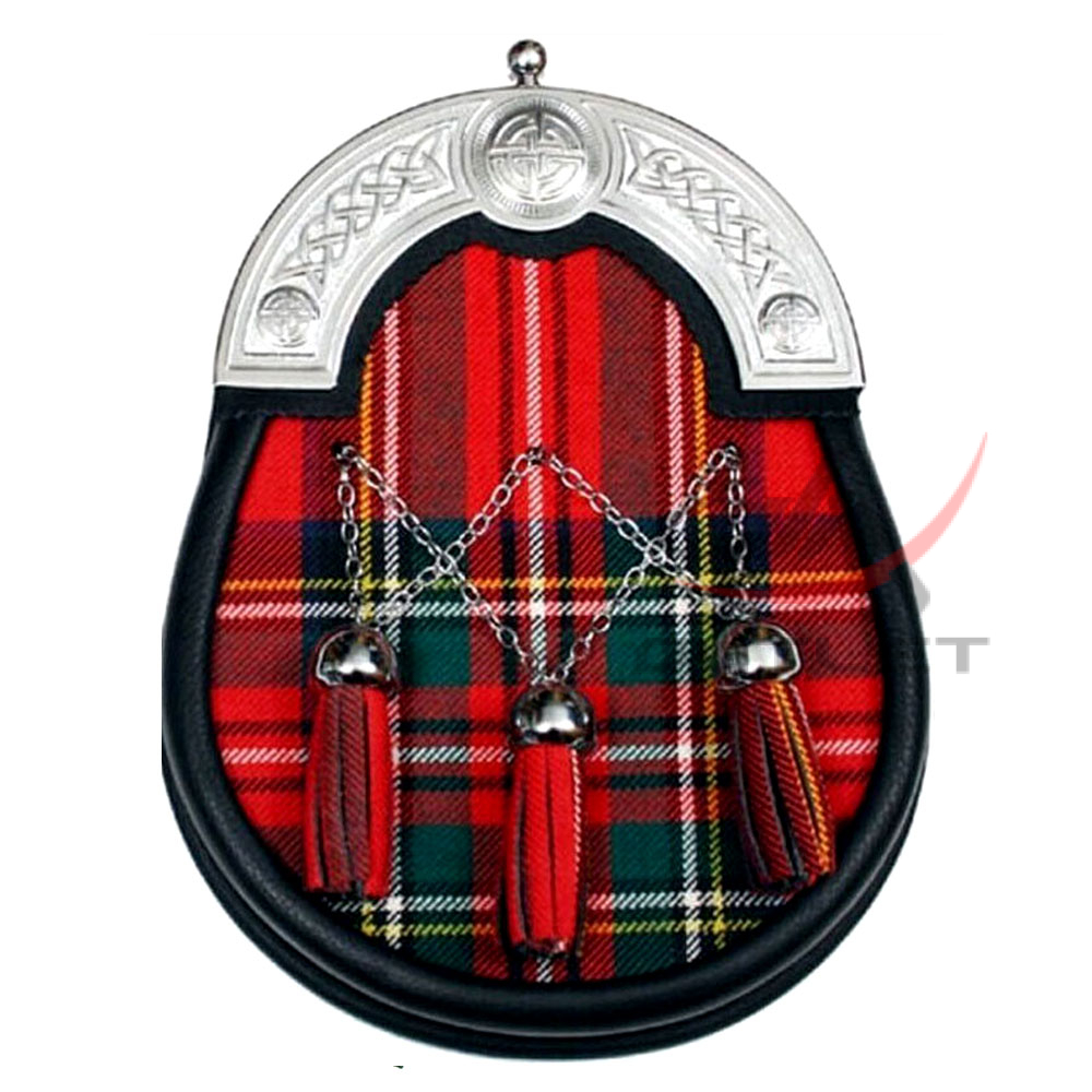Royal Stewart Tartan Full Dress Leather Sporrans Introducing the Scottish Kilts Outfit Sporran, crafted from 100% genuine leather with a Celtic silver cantle and chain strap. This traditional Wallace Tartan kilt sporran bag embodies Scottish heritage and clan pride. The Black Watch Tartan Sporran is available in full-dress leather, featuring a customizable clan tartan on the front with three matching leather tassels. Made to order, this sporran combines premium-grade leather with a classic Scottish design, offering both value and durability. It’s an ideal accessory for both formal and informal events, perfect for those seeking quality and affordability.