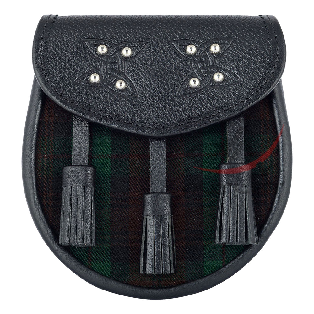 Scottish Sporran Brown Watch Tartan Black Leather Made to Order offers clan pride and customization in a very budget conscious price tag. Your Family Tartan is pasted on the front of the sporran equipped with 3 matching leather tassels.