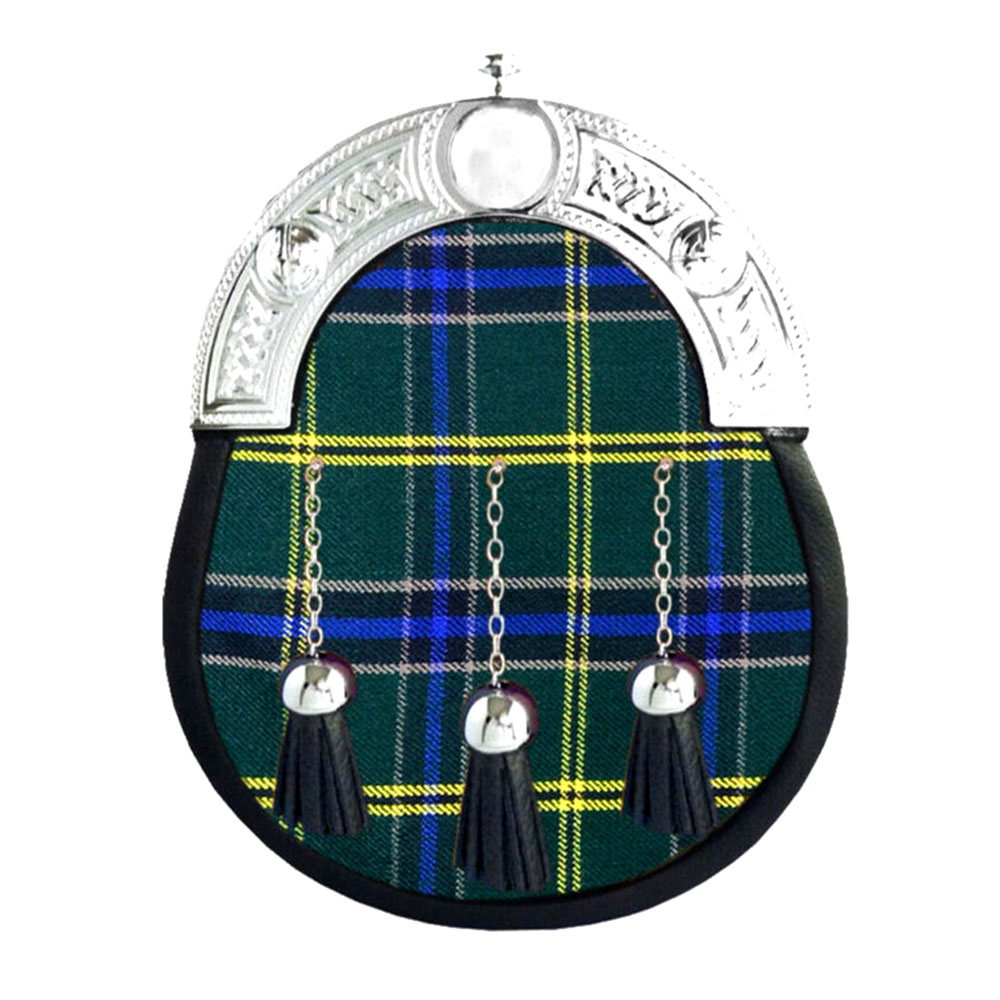 US Army Tartan Full Dress Leather Sporrans Introducing the Scottish Kilts Outfit Sporran, crafted from 100% genuine leather with a Celtic silver cantle and chain strap. This traditional Wallace Tartan kilt sporran bag embodies Scottish heritage and clan pride. The Black Watch Tartan Sporran is available in full-dress leather, featuring a customizable clan tartan on the front with three matching leather tassels. Made to order, this sporran combines premium-grade leather with a classic Scottish design, offering both value and durability. It’s an ideal accessory for both formal and informal events, perfect for those seeking quality and affordability.