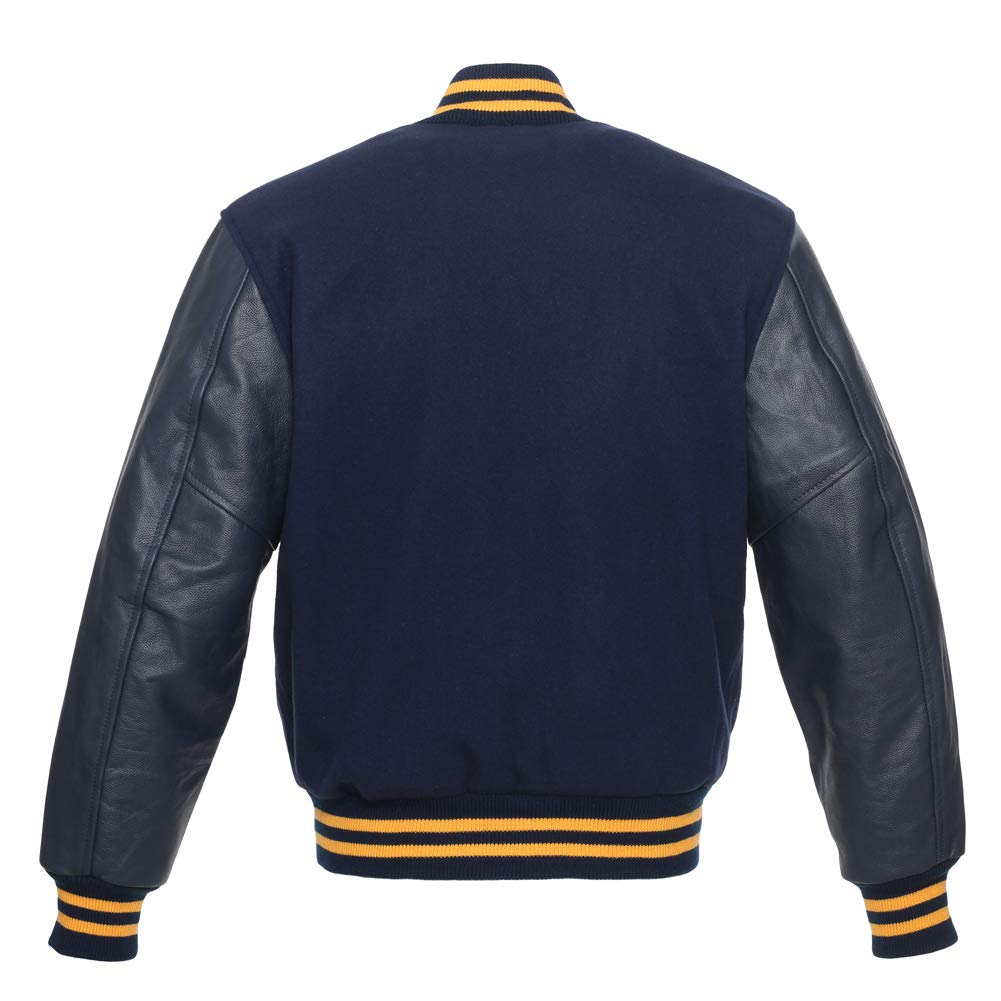 Letterman Varsity Jacket features a wool body and Genuine Cow Leather sleeves, Sleeves are available in wool, vinyl or leather. The Varsity Jacket has a stand-up knit trim collar, cuffs and waist and a traditional snap front closure. As with all of our varsity jackets, the Cambridge can be customized with your choice of inner lining, pocket trim and sleeve materials.